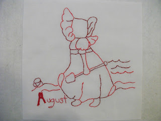 My August Calendar Girl Redwork block is just adorable with her shovel and bucket playing on the beach.