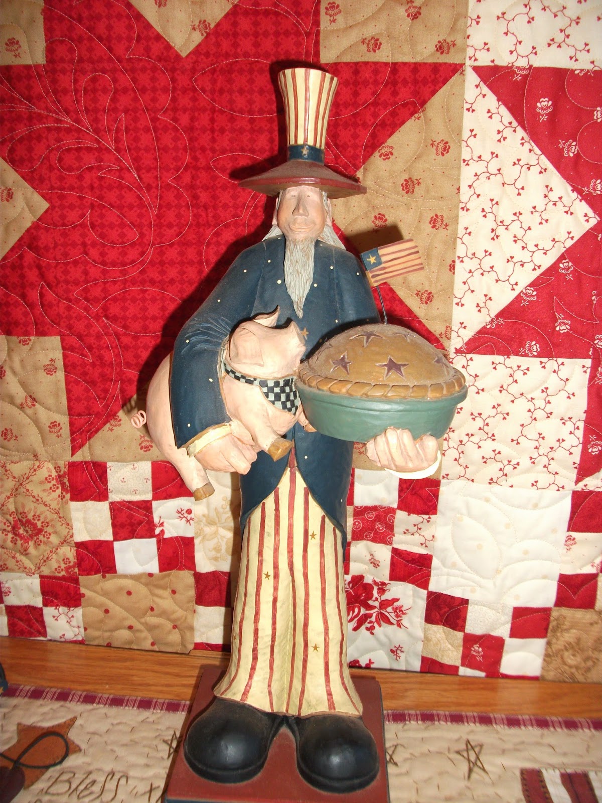 ReplyDeleteI love this post! I have made several of the same quilts, including the one with the house in the center. It was a pattern by Alice from Little Quilts. She taught a 2 day class on the quilt at their shop in Marietta and it was one of my all time favorite quilt experiences. Those ladies are so smart about quilting and the business of it all. I also have the same Uncle Sam figurine!